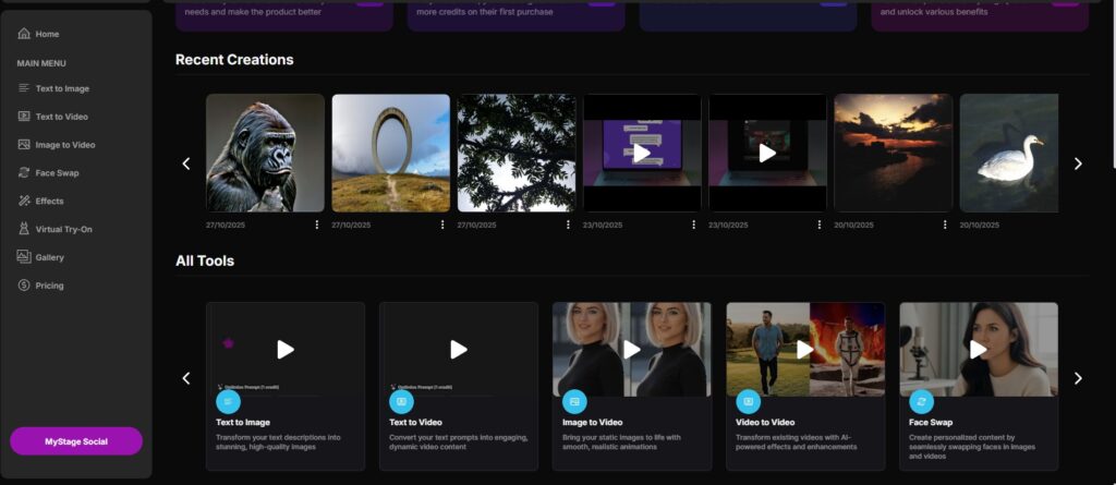 Understanding the Creator Studio Dashboard Estimated reading: 4 minutes 25 views The Creator Studio is the heart of your MyStage.AI experience.It’s where you can access all AI tools, manage credits, review your generation history, and publish your creations — all in a clean, professional workspace. This guide walks you through the layout, main sections, and hidden shortcuts to help you work efficiently. 🖥 Dashboard Layout Overview When you log in to MyStage.AI, you’ll land directly on your Creator Studio Dashboard.The layout is designed to keep your creative process intuitive and straightforward: SectionDescriptionRecent CreationsContains the latest creations you have generated.Left PanelYour main navigation menu — includes all AI tools and quick linksAll ToolsAs in the left panel, you can access the type of AI Tools you want to use right away.EffectsQuick access to a variety of effects.CommunityA selection of publicly available creations from other users.PricingLocated on your left panel. You can top-up credits to use the AI Tools.Mystage.SocialLocated on your left panel. Click it to change on MyStage.SocialAccount Settings & BillingClick your Profile Image in the upper right corner, then select Account Settings. 💡 Tip: You can mark your favorite tools with a heart icon ❤️ to make them appear at the top of your Tools Panel for faster access. ⚙️ Key Dashboard Sections 1. AI Tools Menu Located in the left panel, this menu gives you instant access to every AI generation feature. Text-to-Image, Image-to-Video, Video-to-Video, FaceSwap, Consistent Character, Music, and more. Each tool has its own interface optimized for its function.When you open a tool, it loads in the main workspace without leaving the dashboard. Each tool offers various options, such as aspect ratio, camera control, and more. Not all options are available for every tool, as each supports different features. Not all options are available for all tools, each one supports different ones. 2. Generation Workspace This is the central area where you create, preview, and download your results.Depending on the tool you use, you’ll find: Prompt field for instructions or descriptions Model selector (e.g., FLUX, Stable Diffusion) Resolution/aspect ratio settings Generate button Preview and download options After a generation completes, results are automatically saved to your Gallery. 3. Gallery Section Every generation you make, image, video, or audio, is automatically stored here. You can: Revisit and download past results Check which model and settings were used View credit usage per generation Delete or re-run previous prompts 🗂 Your Gallery is securely stored in the cloud, accessible from any device when you log in. 4. Wallet & Credits Overview Click your Icon in the top left corner, then select Account Settings. On your menu, you will see the Billing section. Current credit balance Recent transactions (spent/added) Links to buy credits or activate a subscription Bonus balance (e.g., referral rewards) Credits are shared across MyStage.AI and MyStage.Social, so you can use the same wallet (same account) everywhere in the ecosystem. 5. Notifications & Updates The bell icon in the top bar displays: Generation completions System updates or new feature releases Credit or payment confirmations Referral notifications 6. Publishing Tools When you’re happy with a creation, you can publish it directly to MyStage.Social from within your dashboard. Click Publish on any generated file. Add a caption, hashtags, and visibility options (Public or Private). Confirm, and your post appears instantly on your MyStage.Social profile. ⚡ Pro Tips for Efficiency Keep your most frequently used tools favorited for one-click access. Regularly check your History to track which prompts or settings perform best. Keep your browser up to date to avoid rendering issues. Watch for announcements in Notifications, new models, and features roll out frequently.